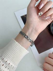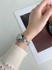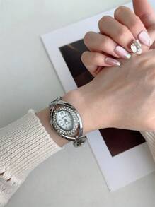 Shein - 1pc Oval Shaped Gold/Silver Color Quartz Watch With Zirconia Stone Bracelet, Fashionable Wrist Watch