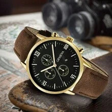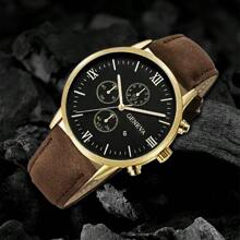 Shein - 1pc Set Vintage Style Brown Leather Quartz Watch & Beaded Bracelet