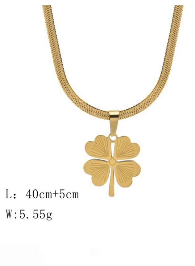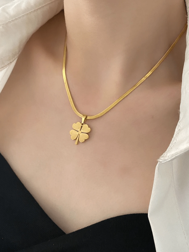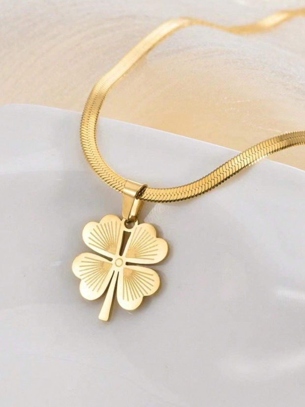 Shein - 1pc Stainless Steel Necklace With Yellow Four Leaf Clover Pendant