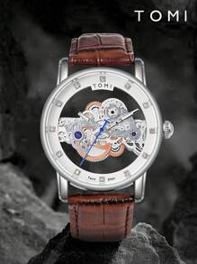 Shein - 1pc TOMI Men's Fashion Advanced Technology Hollow Gear Rhinestone Leather Quartz Watch,
