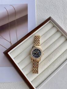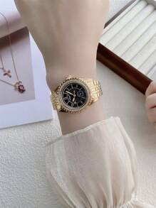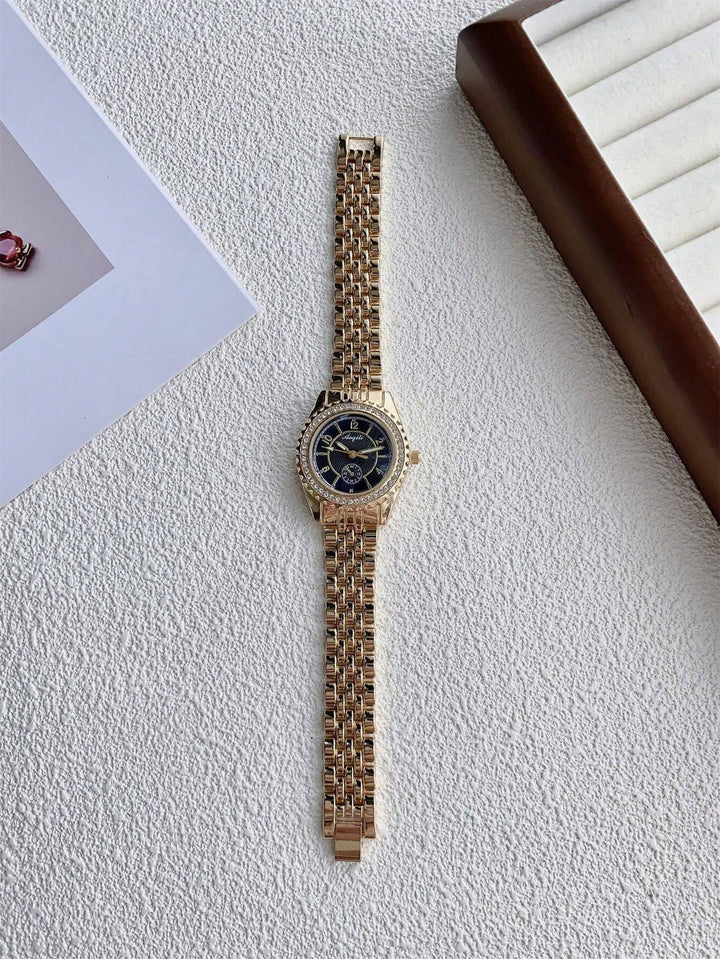 Shein - 1pc Women's Black Dial Gold Round Case Stainless Steel Band Wristwatch,