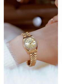 Shein - 1pc Women's Gold Stainless Steel Strap Quartz Watch With Calendar Function, 3ATM Water Resistant, Simple Business Style