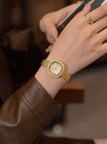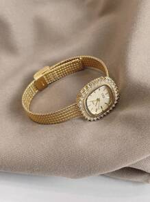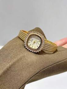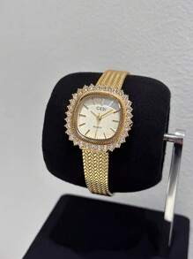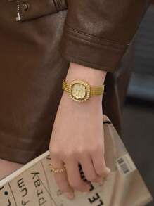Shein - 1pc Women's Simple Stainless Steel Watch With Rhinestone Decor Square Dial And Clasp