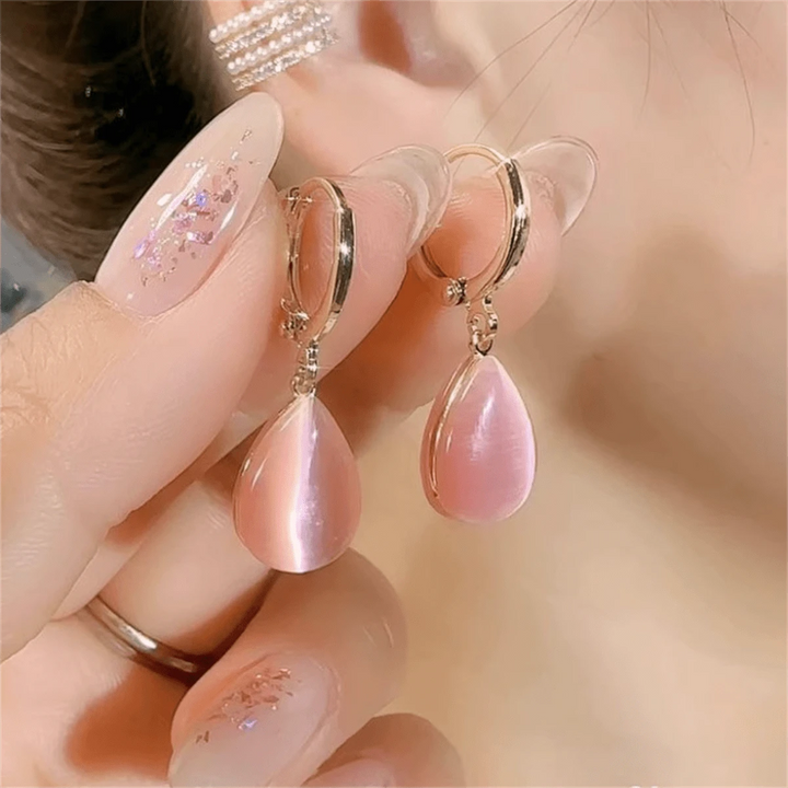 Shein - 2024 New Trendy Pink Water Drop Double-Side Cat's Eye Stone Earrings