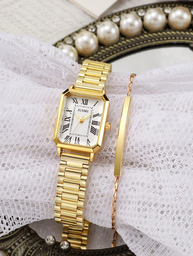 Shein - 2pcs/Set: Elegant Fashion Women's Quartz Watch With Roman Numeral Dial And Minimalist Steel Band