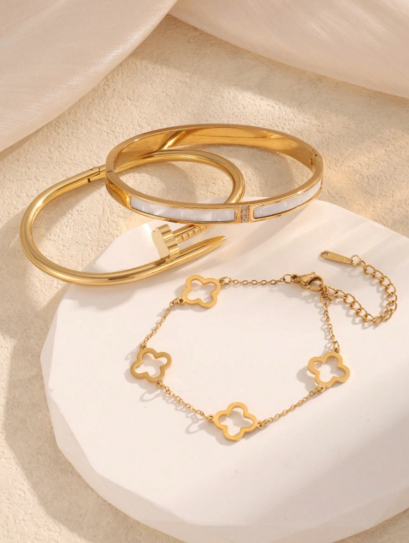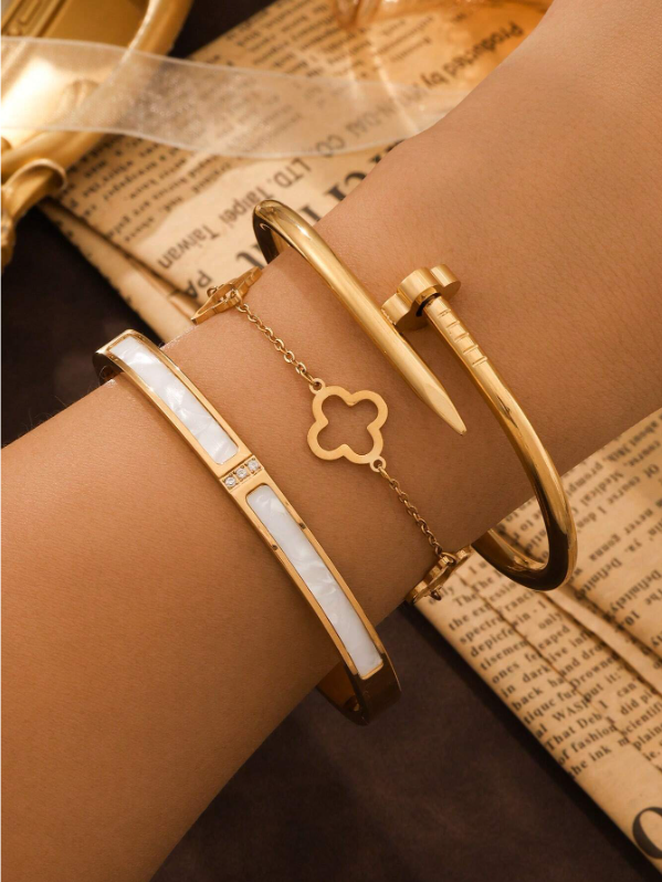 Shein - 3Pcs Gold Stainless Steel Nail & Shell Bracelet With Clover Charm Bracelet Set