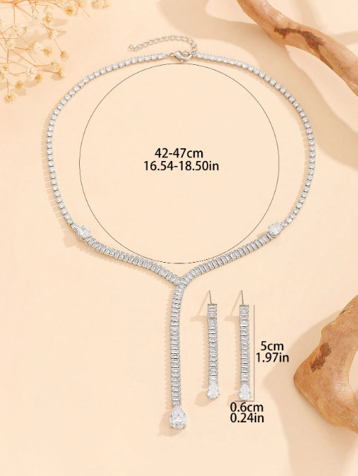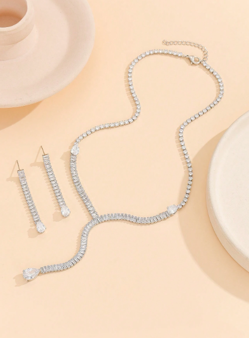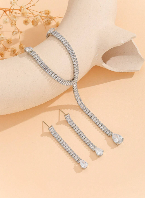 Shein - 3pcs Set Copper Cubic Zirconia Stone Bridal Necklace & Earrings