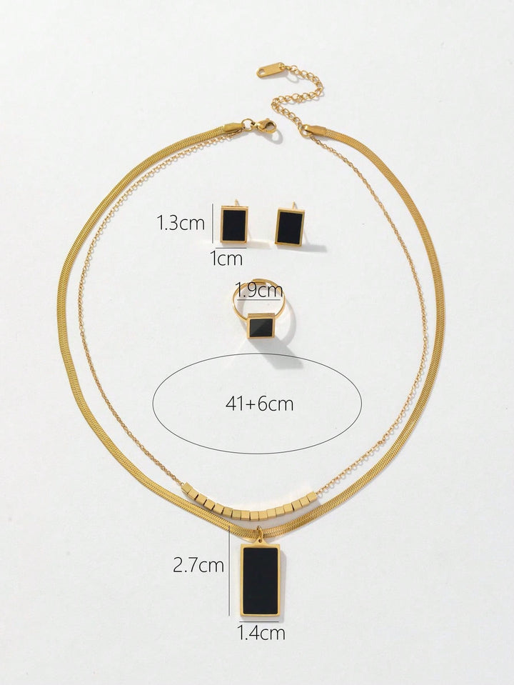 Shein - 3Pcs/Set Fashionable Stainless Steel Gold Double Chain Square Black Card With Steel Beads Necklace, Earrings, Ring Set For Women
