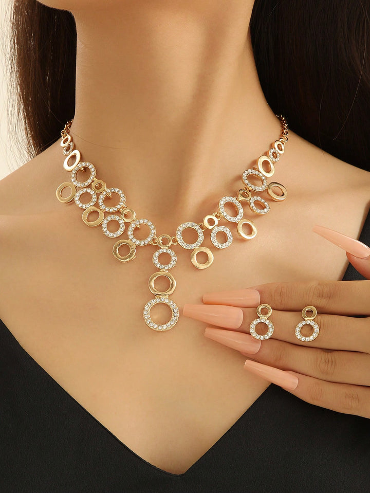 Shein - 3Pcs/Set Gold Plated Circle Shaped Jewelry Set With Full Rhinestone For Women'S Gorgeous Banquet