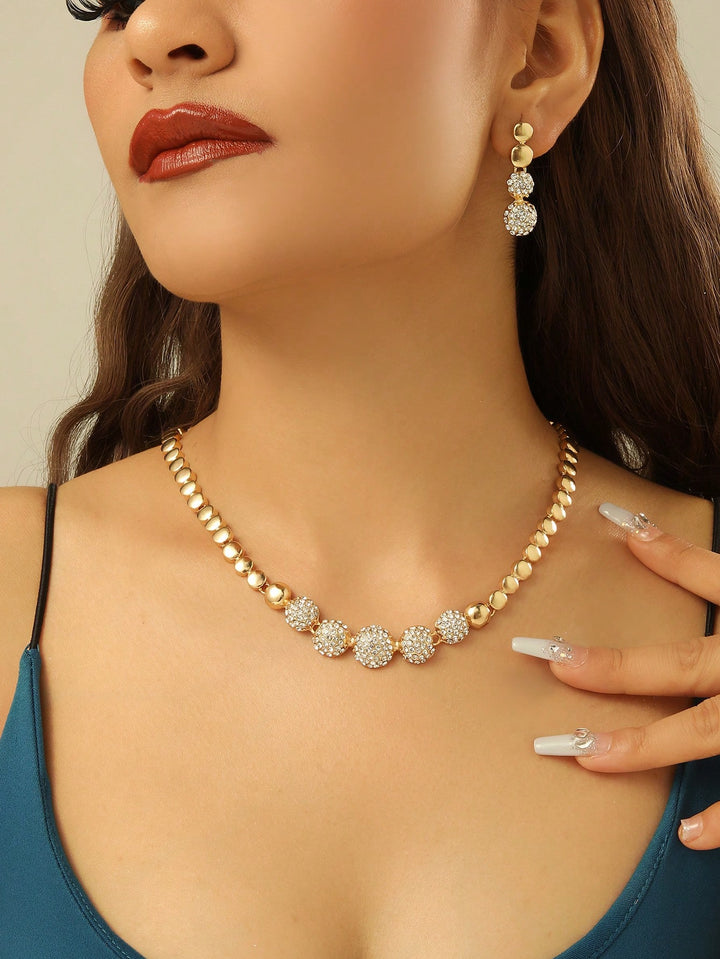 Shein - 3Pcs/Set Gold Plated Full Rhinestone Round Style Necklace And Earrings Set For Women, Luxury Wedding Jewelry Set