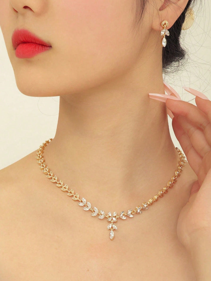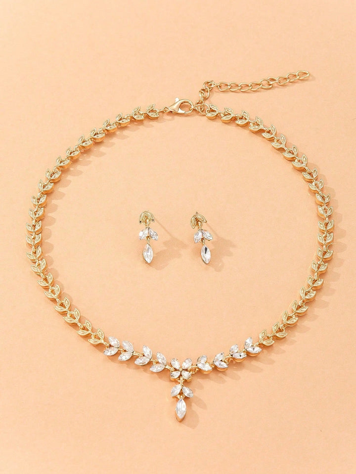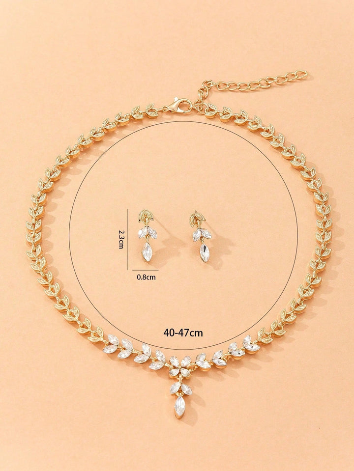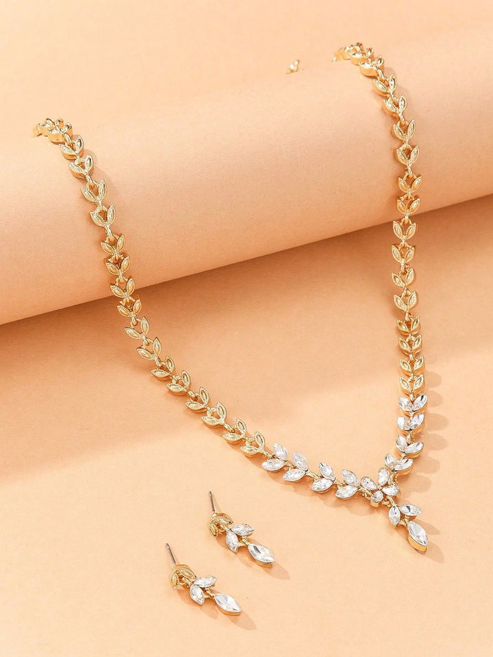 Shein - 3Pcs/Set Golden Alloy Leaf Shape & Rhinestone Decor Earrings And Necklace Set For Women