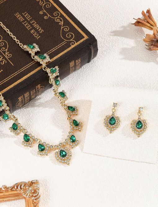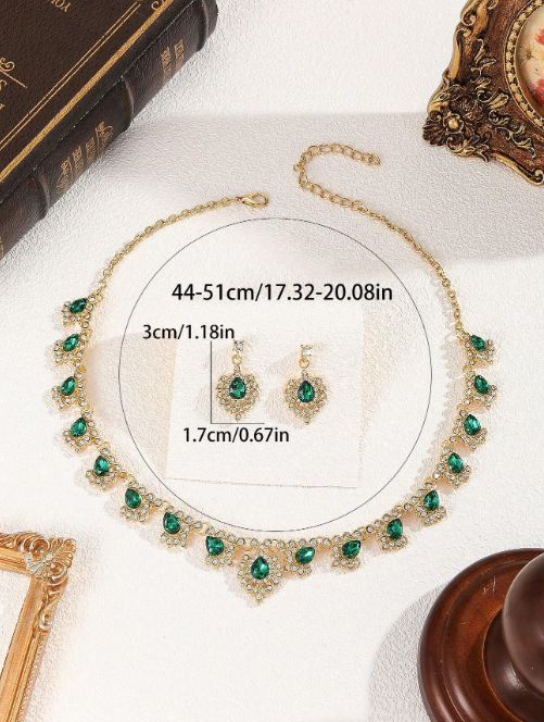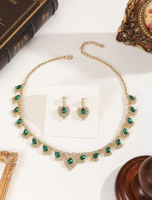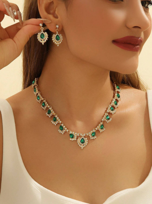 Shein - 3pcs Set Green Glass Water Drop Peacock Crystal Women Earrings & Necklace Wedding Jewelry