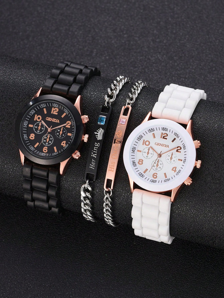 Shein - 4pcs Geneva Black & White Silicone Watch Band Couple Watch Set With Metal Chain Bracelet