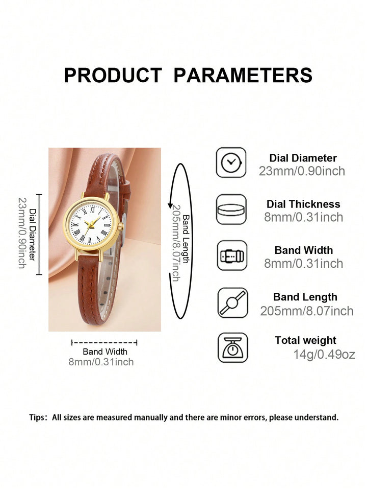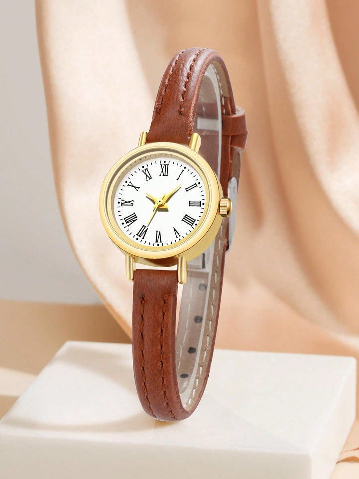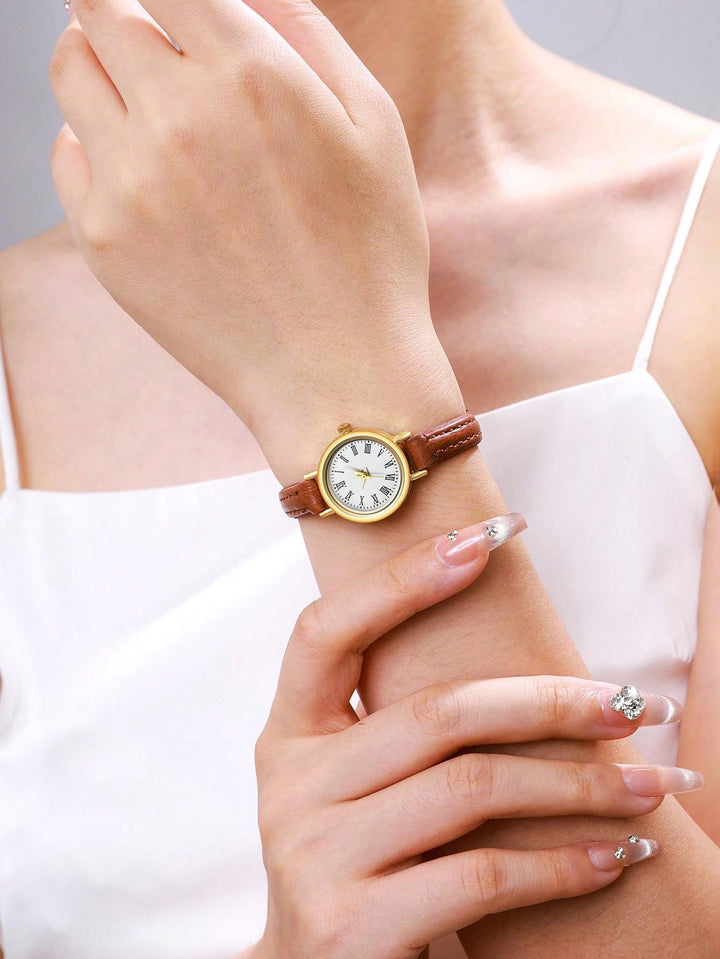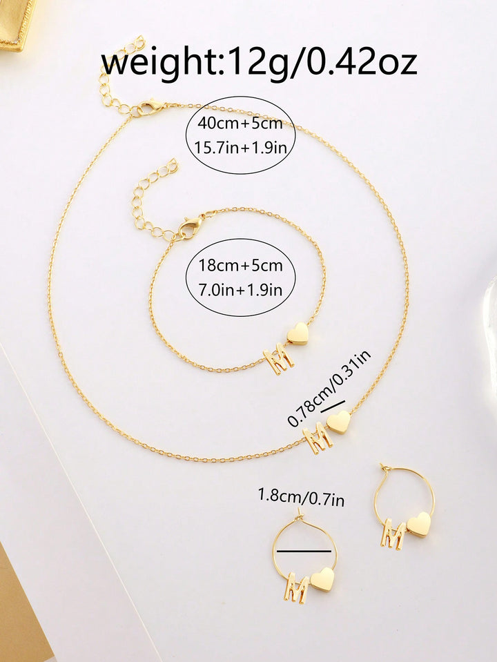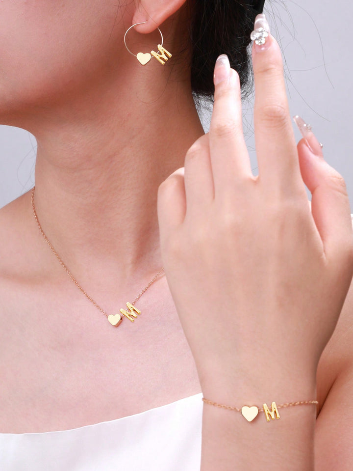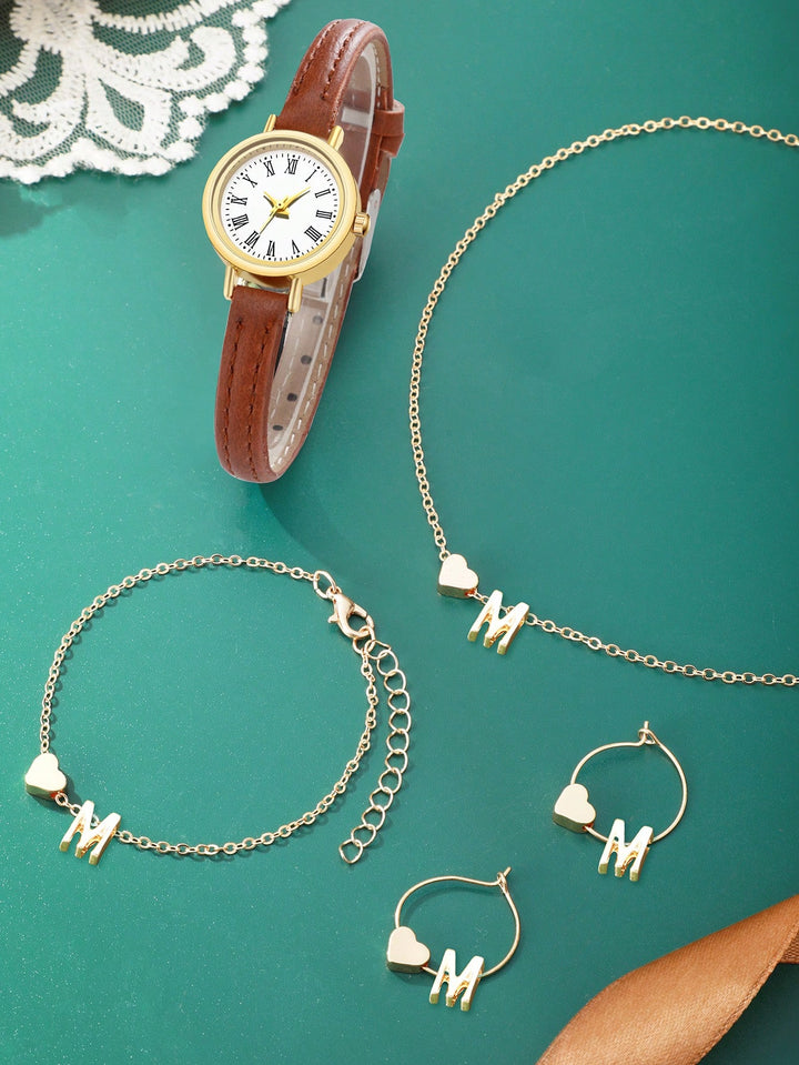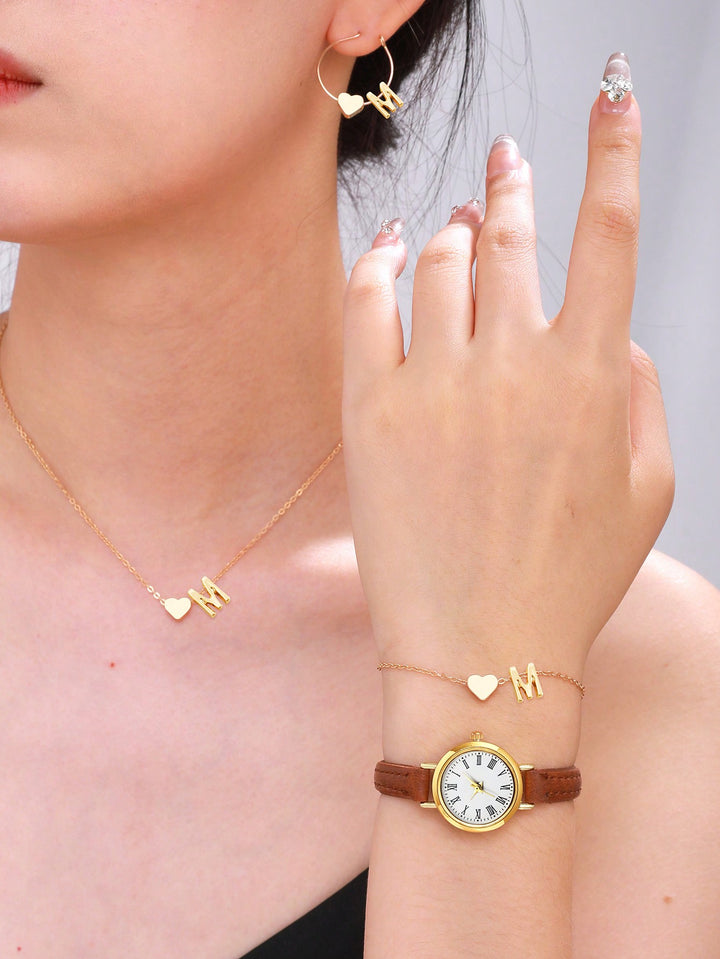 Shein - 4pcs Gold-color M Letter With Heart Design Necklace, Bracelet, Earrings Set And 1pc Women's Simple Quartz Wristwatch With Pu Band