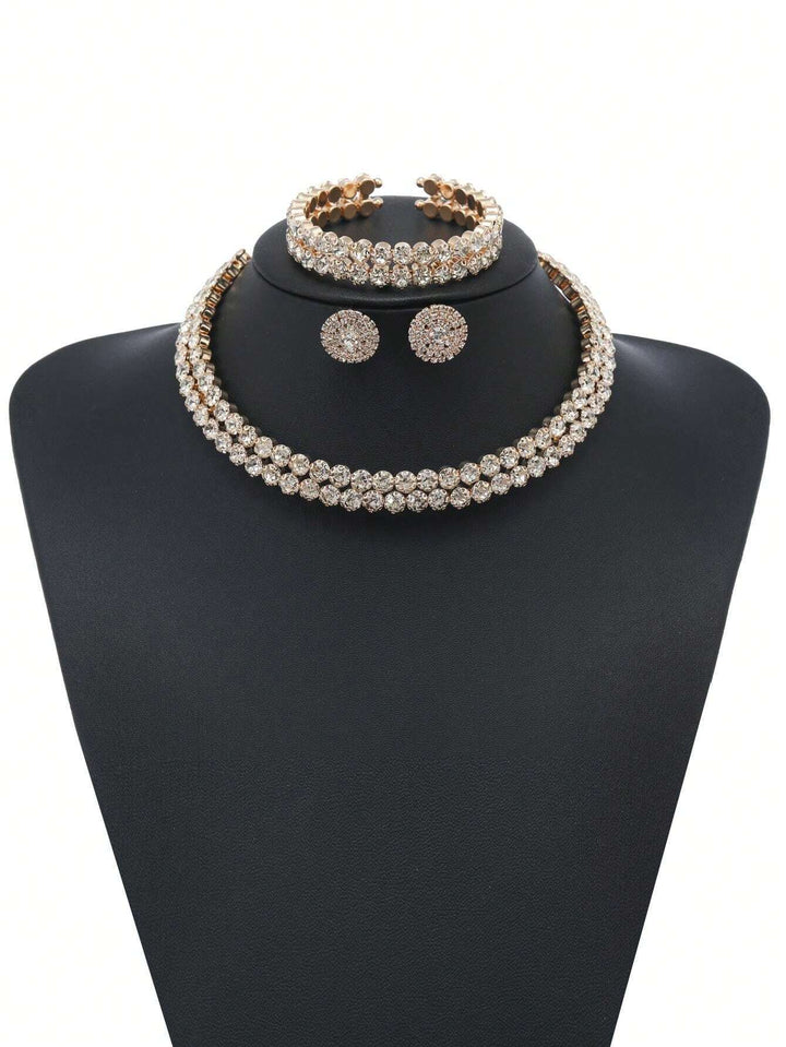 Shein - 4pcs/Set Elegant Rhinestone Gold Plated Round Collar Necklace Set