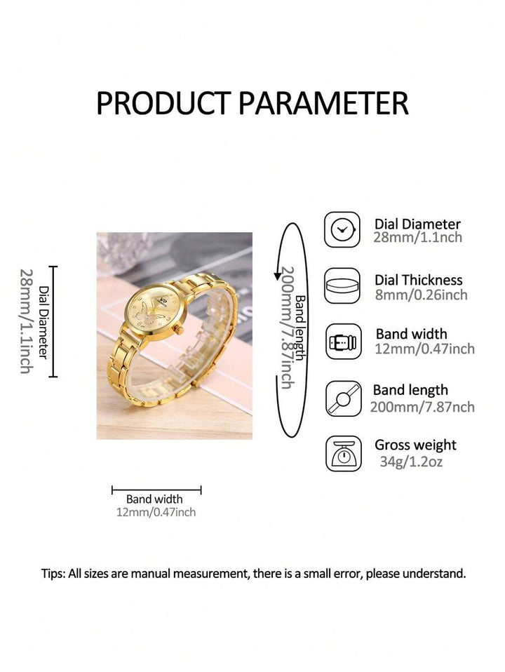 Shein - 5pcs Fashion Simple And Compact Roman Rhinestone Round Needle Gold Steel Band Women's Quartz Watch & Jewelry Set