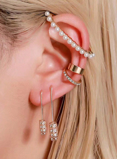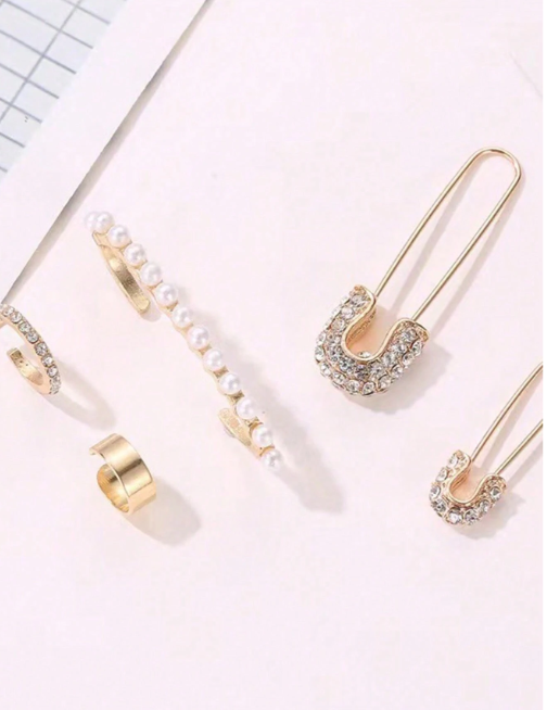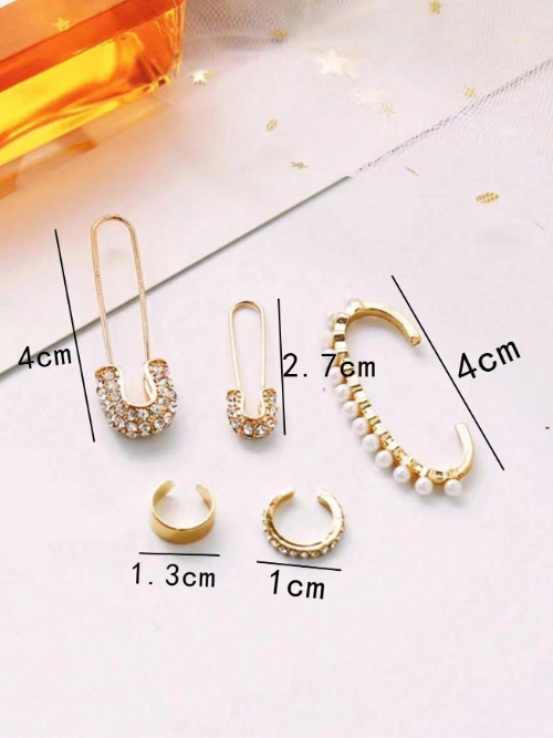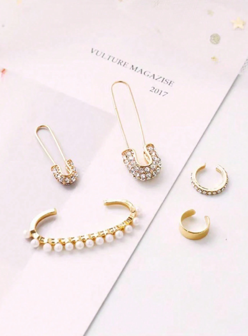 Shein - 5pcs/Set Retro Creative Rhinestone Metal Personality Pearl Earrings Set