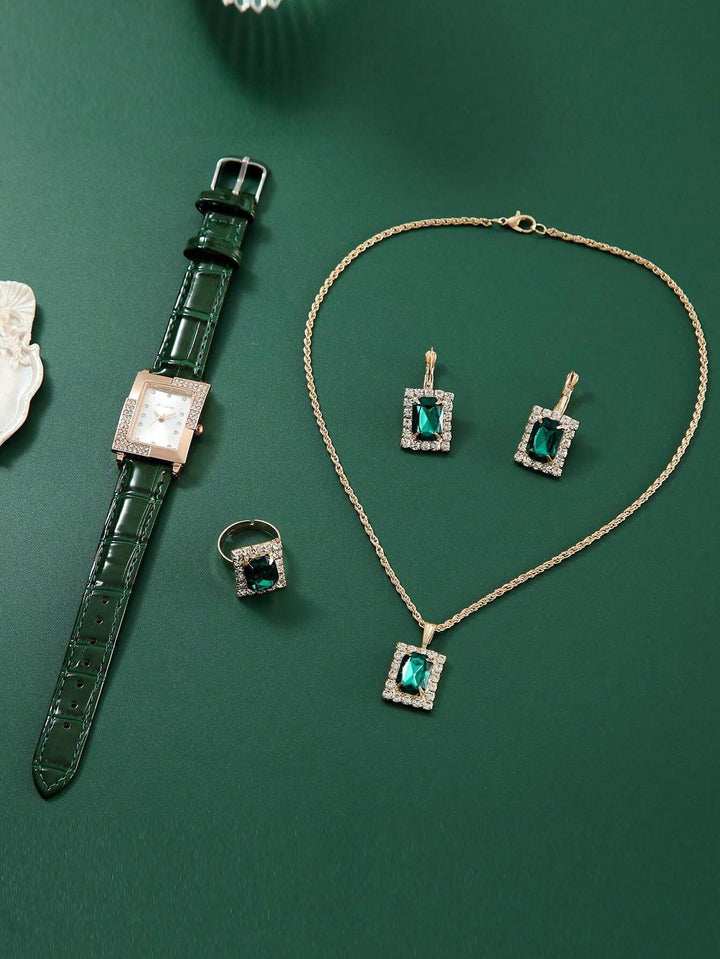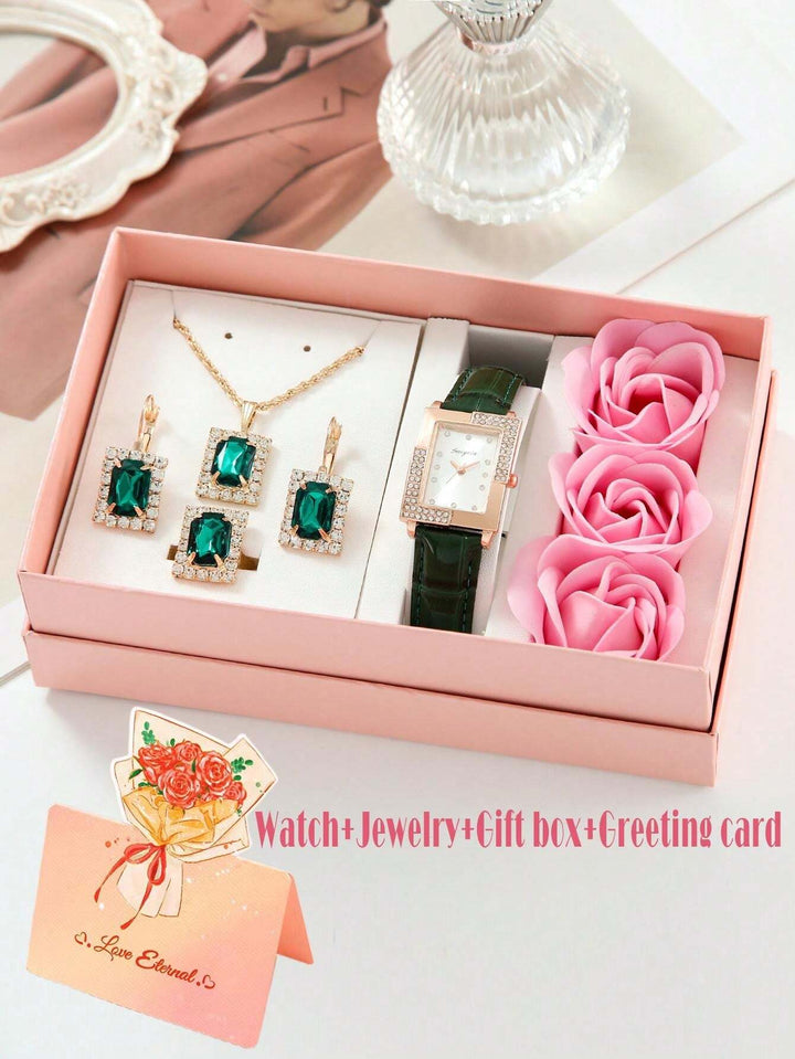 Shein - 6pcs/Set Includes A Green Fashionable And Elegant Square Diamond Inlaid Watch Case And A Beautiful Pink Gift Box Containing Pink Flowers, And A Rose Greeting Card