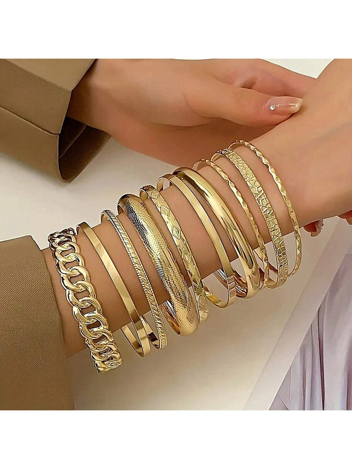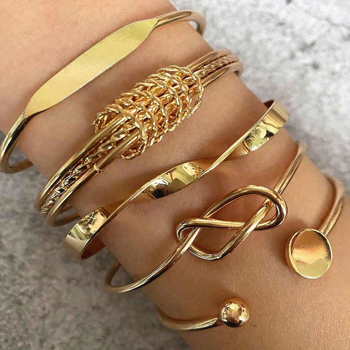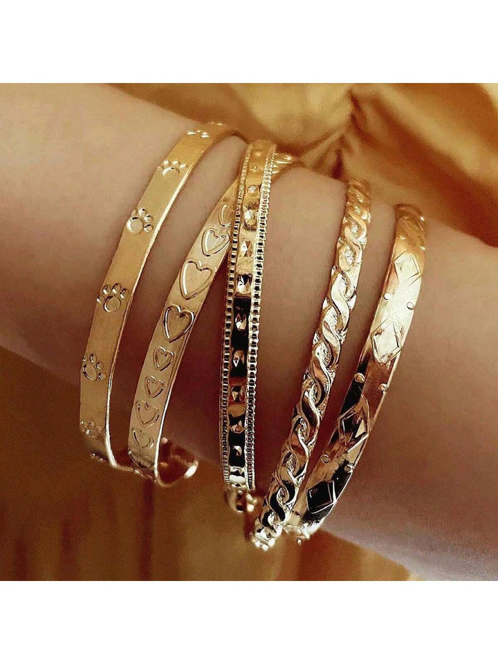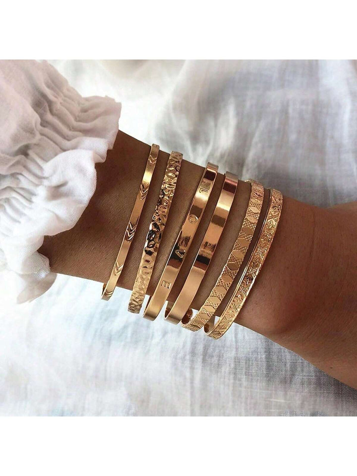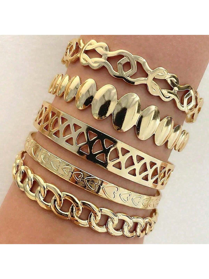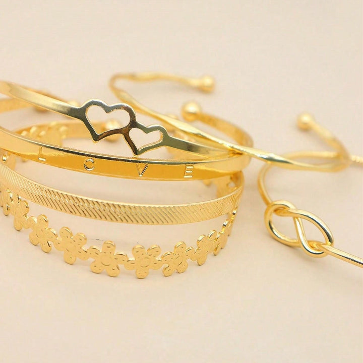 Shein - 6pcs/set Personality Love & Flower & Om & Uppercut Ring Shaped Creative Stainless Steel Bangle, Mideast Gold Color