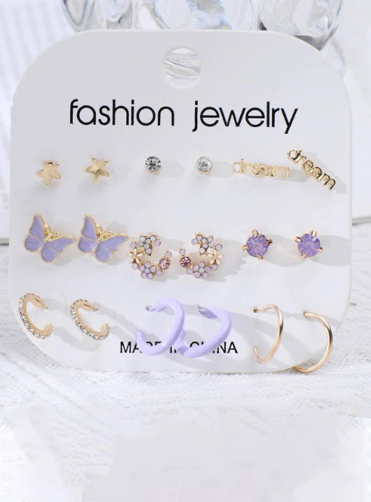 Shein - 9pairs/set Fashionable Rhinestone & Butterfly Decor Earrings Set For Women For Daily Jewelry Accessories