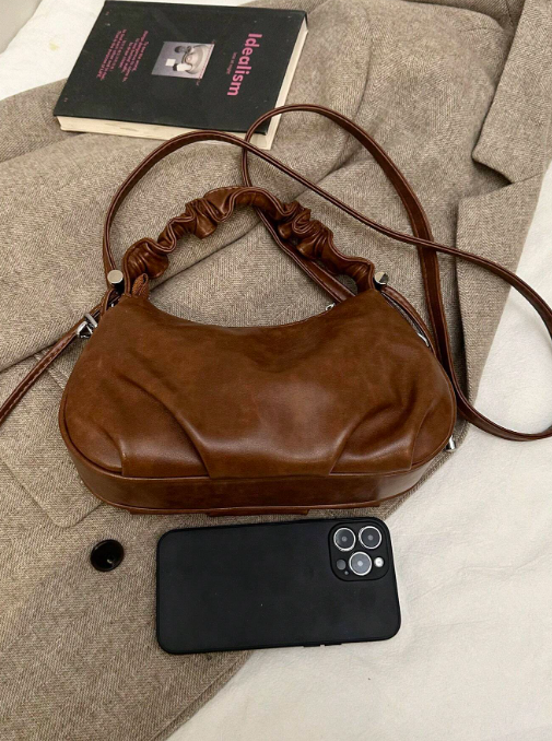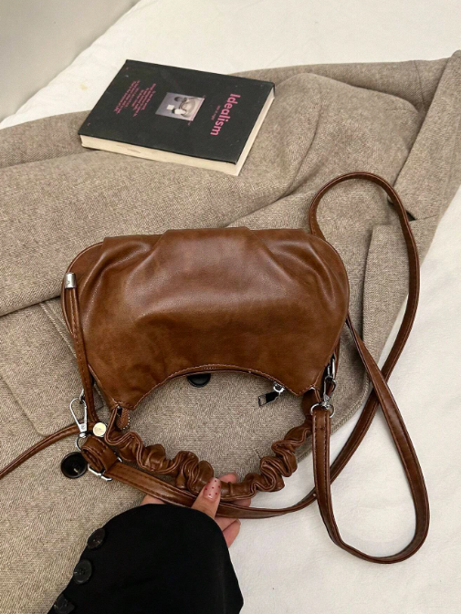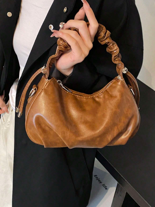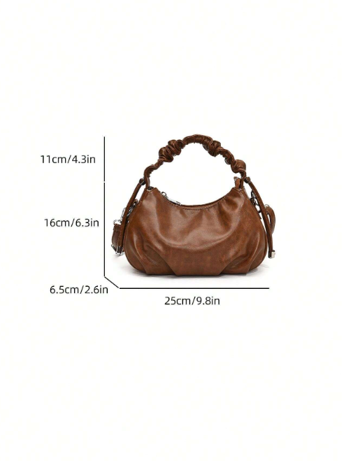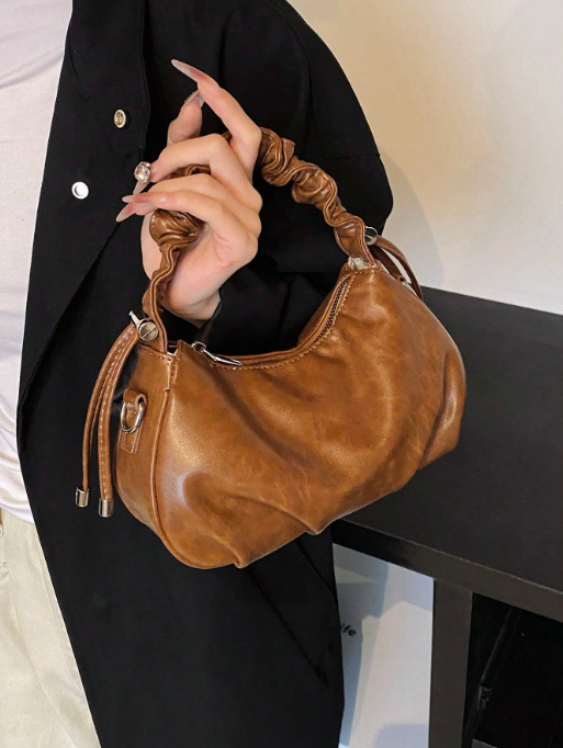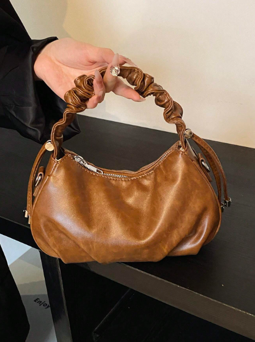 Shein - A Brown Pu Elegant Simple Retro Style Pleated Twist Drawstring Zipper Hand-Held Crescent Bag