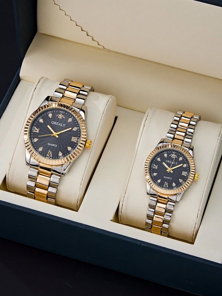 Shein - Couple's Fashionable Waterproof Rhinestone Decor Gold Strap Watch Band, Luxury Gift Set