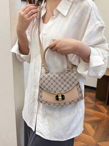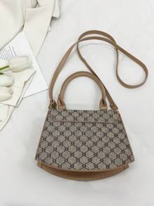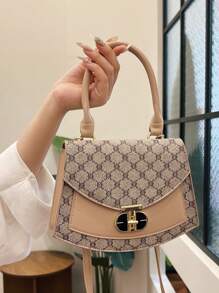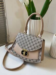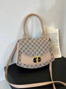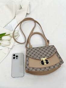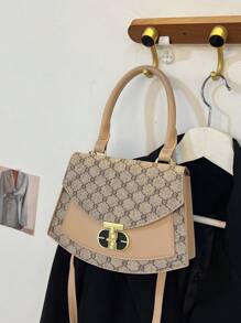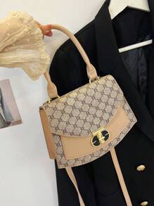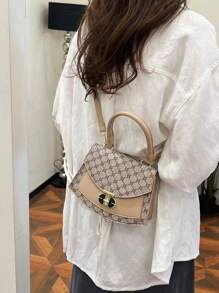 Shein - Fashion Flap Geometric Pattern Vintage Print Handbag Khaki
