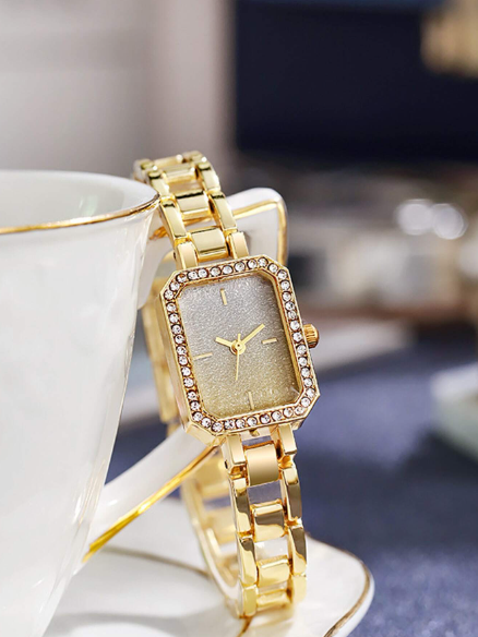 Shein - Fashionable & Elegant Square Shape Full Starry Rhinestone Lady Quartz Watch