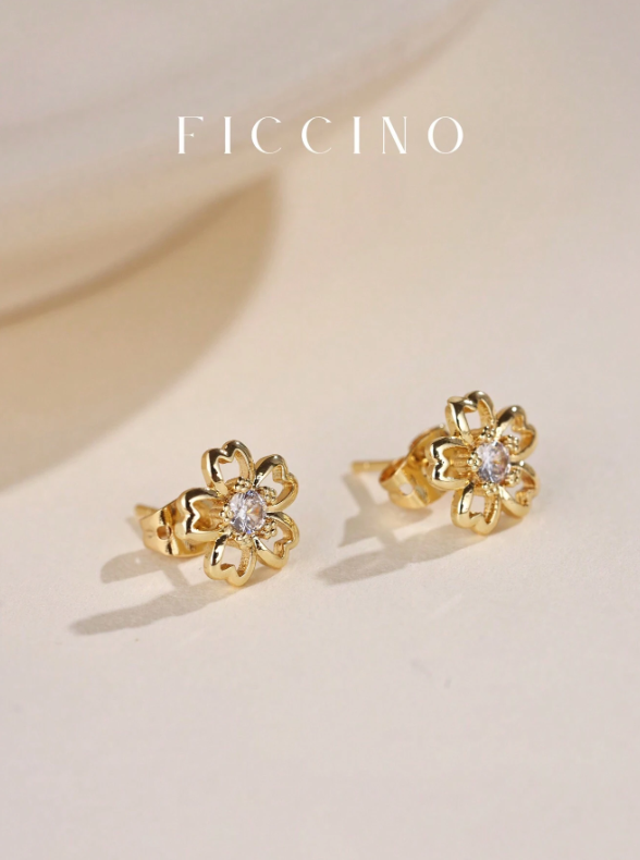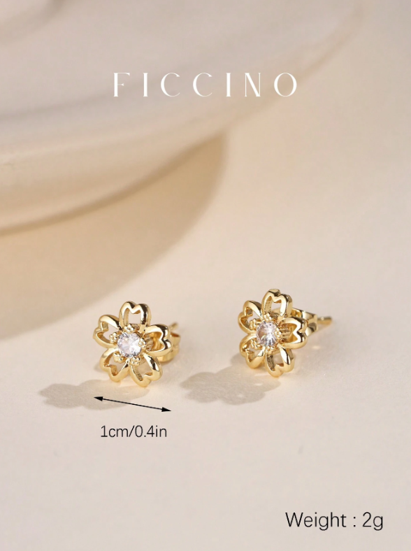 Shein - FICCINO Gold Plated Cubic Zirconia Cherry Blossom Stud Earrings