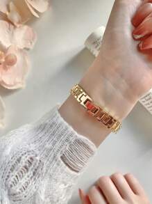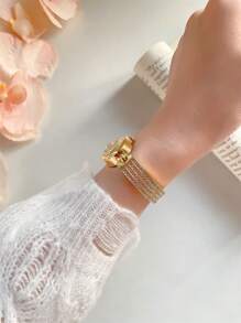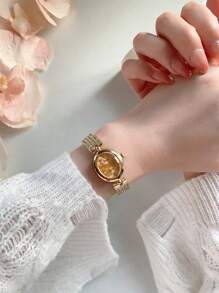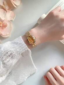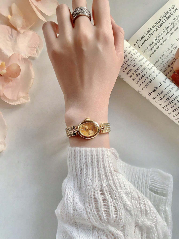 Shein - Full Rhinestone Gold-Plated Watch For Women, Oval Dial With Quartz Movement, Fashionable Bracelet Watch