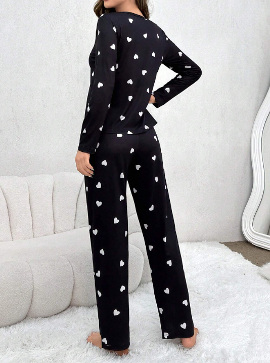 Shein - Ladies' Heart Print Long Sleeve Long Pants Pyjama Set