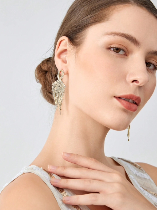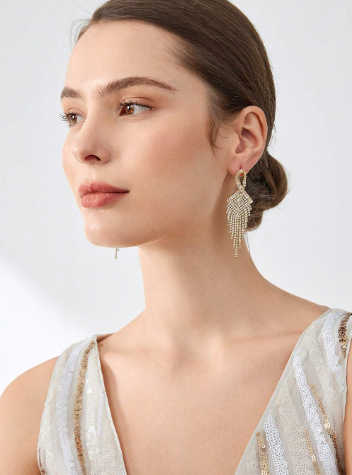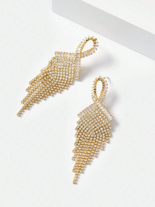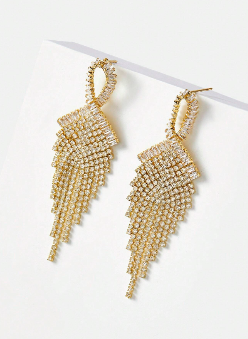 Shein - Motf Premium 18K Gold Plated Zirconia Inlaid Tassel & Rhinestone Elegant Earrings