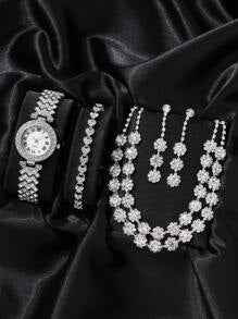 Shein - pc Ladies Watch Women Silver Zinc Alloy Strap Glamorous Rhinestone Decor Round Dial Quartz Watch & 4pcs Earrings Bracelet Necklace Jewelry Set