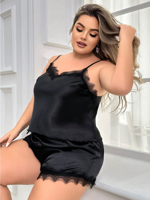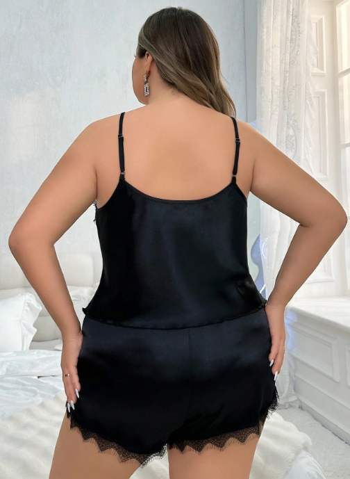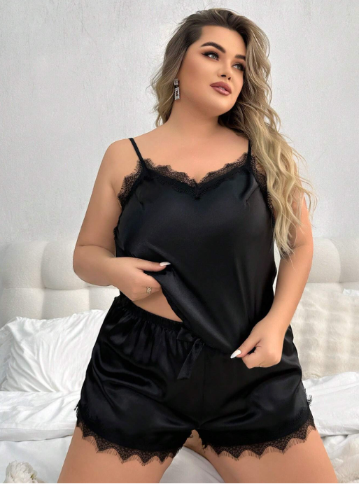 Shein - Plus Size Women's Lace Trimmed Satin Cami Top And Shorts Pajama Set