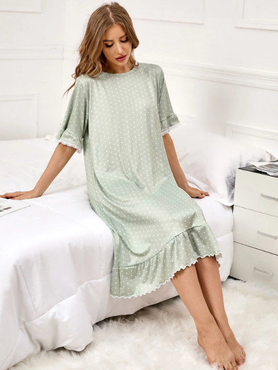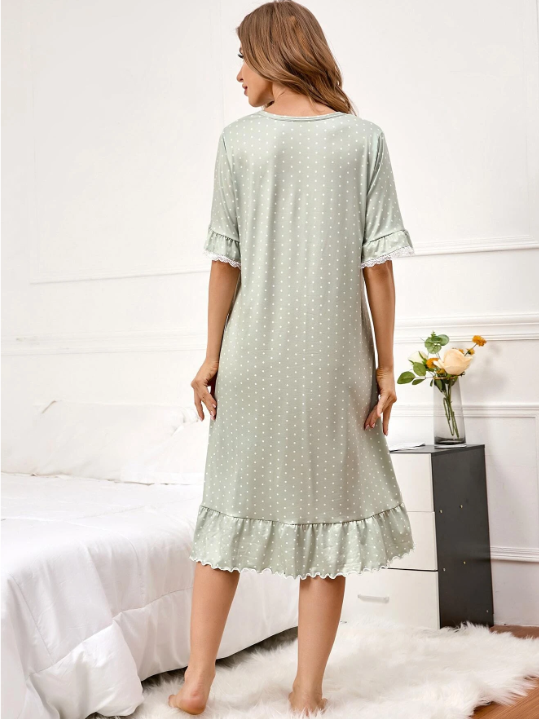Shein - Polka Dot Print Flounce Sleeve Ruffle Hem Night Dress