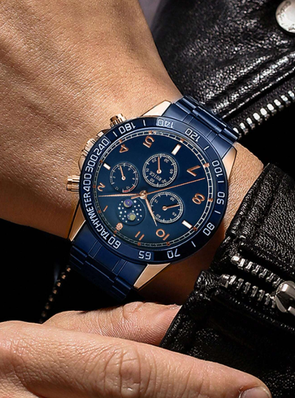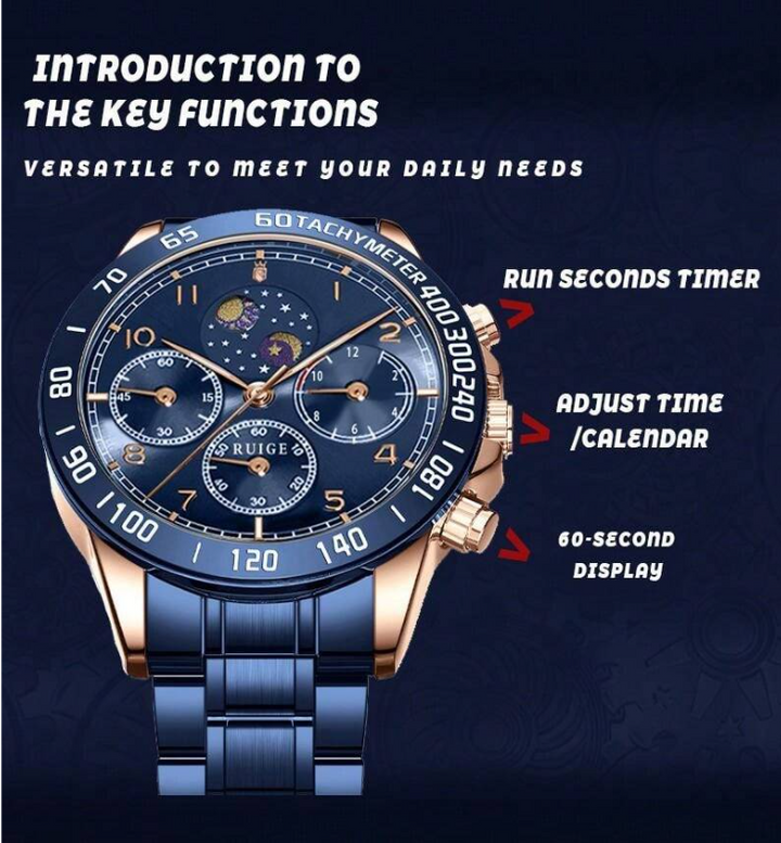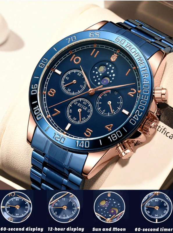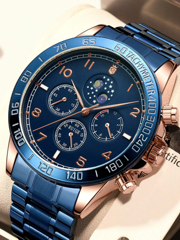 Shein - RUIG RUIGE Men Quartz Luxury Sport Moon Phase Display Stainless Steel Multifunctional Wristwatch