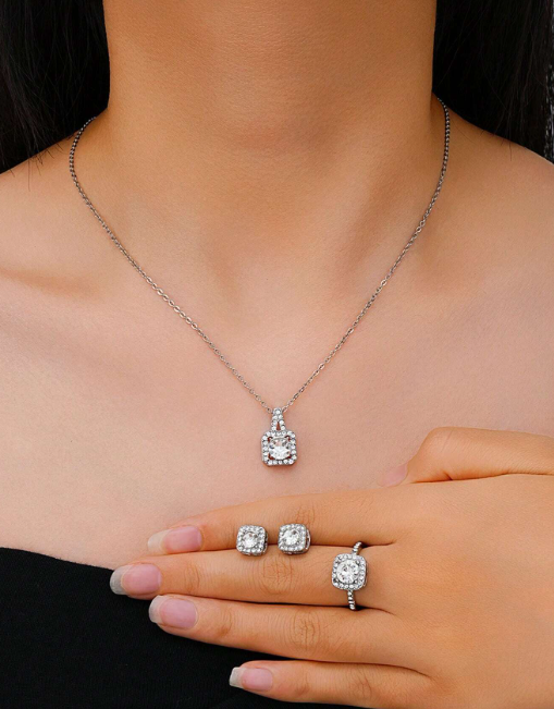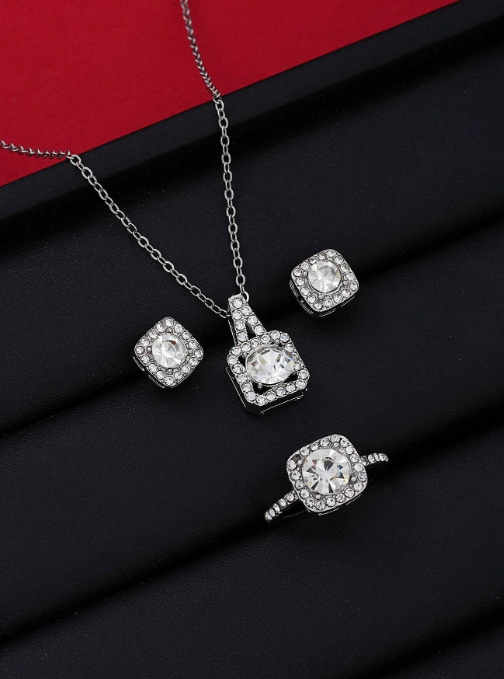 Shein - 4pcs/Set Fashionable Minimalist Luxury Elegant Titanium Steel Cubic Zirconia Square Earrings, Ring, Pendant Necklace Jewelry Set