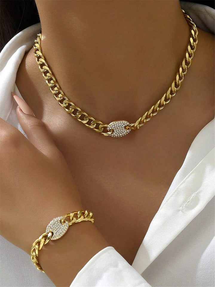 Shein Simple and Elegant Geometric Chain Gold 2 Piece Necklace and Bracelet Set for Women