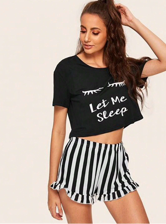 Shein - Summer 2024 New Arrivals Simple Letter Printed Short Sleeve Top & Striped Shorts Homewear Set