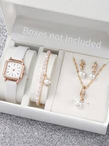 Shein - Women's Leather Strap Fashionable Simple Square Dial Quartz Wristwatch + Pearl Jewelry Set (5pcs/Set)