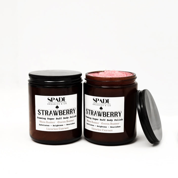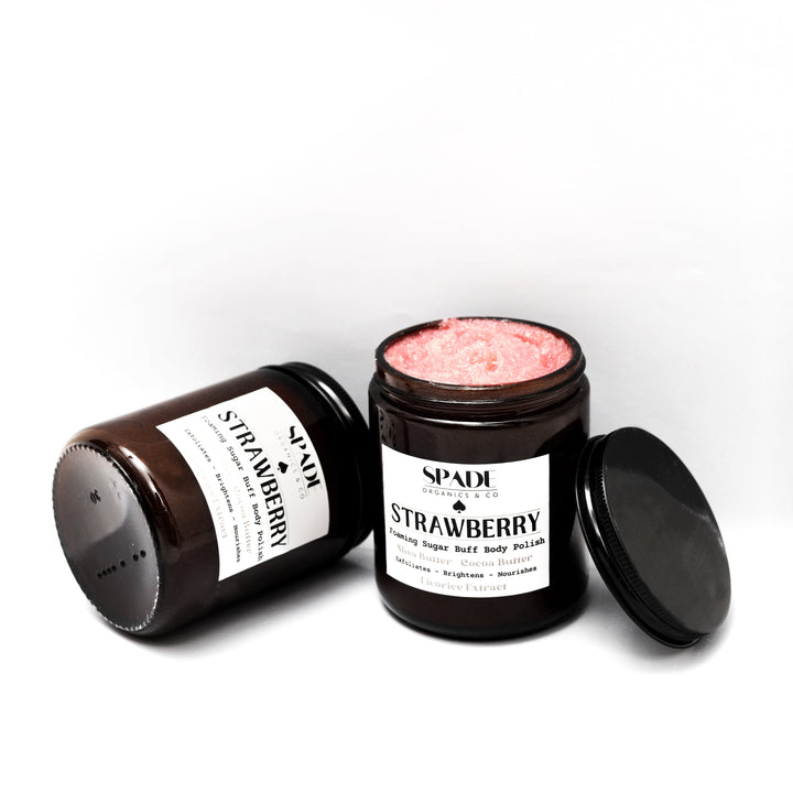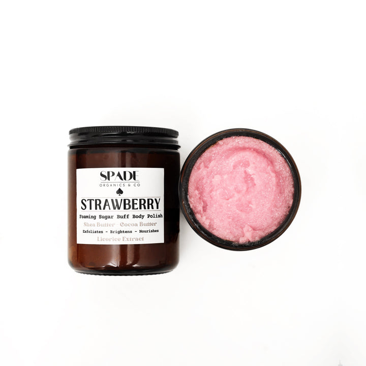Buff away impurities and reveal soft, glowing skin with our Natural Strawberry sugar scrub. Packed with Shea Butter, Cocoa Butter, Licorice extract, Chamomile extract, Aloe Vera extract, Vitamin E, and natural oils like Jojoba, Sweet Almond, and Sunflower, this body polisher will leave you feeling and smelling great.