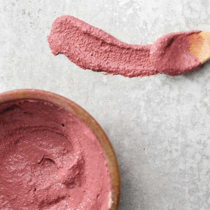 Water contact changes mask color to purplish pink with natural rose and hibiscus powder.
