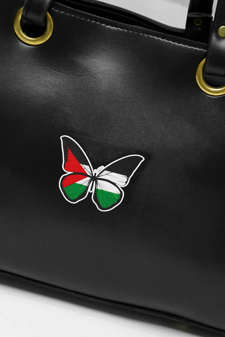 This tote bag makes a powerful statement with its stunning butterfly design. The butterfly's wings incorporate the colors of the Palestinian flag, creating a unique and meaningful symbol of hope and solidarity. The bag is crafted from high quality synthetic leather and its spacious design makes it perfect for carrying all your everyday essentials.