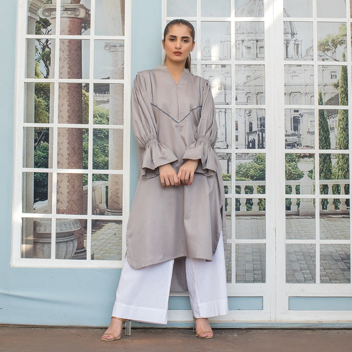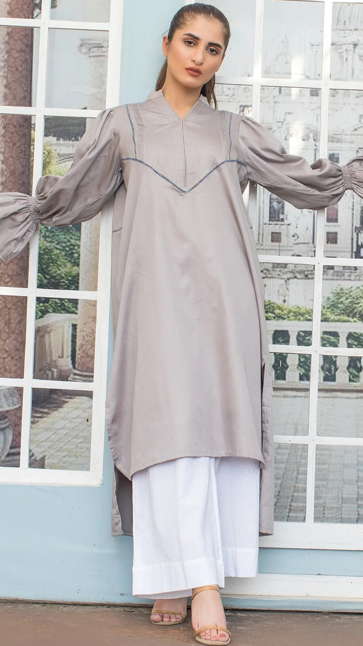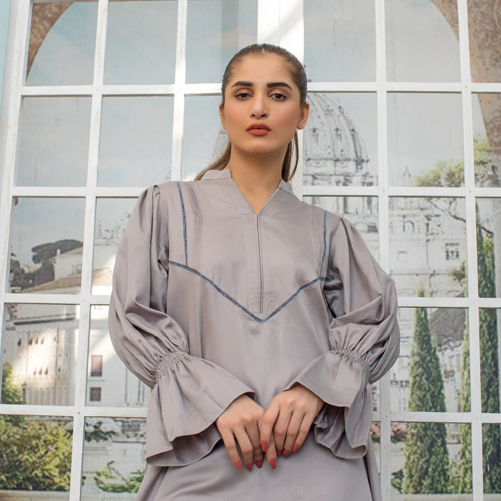 Embrace effortless elegance with this stylish Grey Long Dress. Featuring vibrant lace and Pleat work along the neckline, and smoked sleeves. This long-sleeve dress is perfect for festive occasions Ladder Lace work at York V Shape with Six Pleats. Piping work at Neck Line , Smoking at Sleeves 100% Cotton Satin / Gentle Wash , Cool Iron |