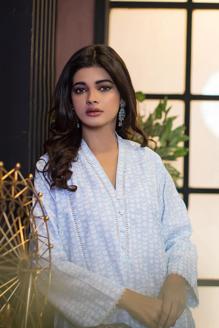 Printed shirt dress in moon/sky cotton fabric with intricate lace details at the neck, body, and sleeves. Puckered fabric-wrapped buttons at the placket for a confident look.