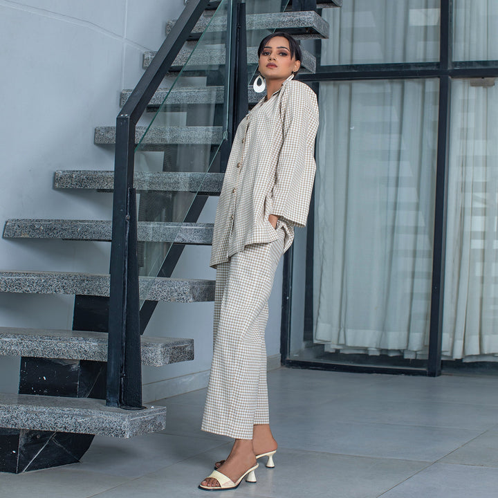 This fascinating yarn dyed ensemble is perfect for a trendy look. It features a mesmerizing, elegant 2-piece design in golden opening buttons with a abstract check pattern of yarn dyed medium brown hues. The matching pants also have an aesthetically rich design perfect for a statement look.
