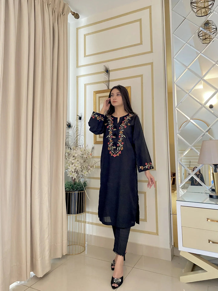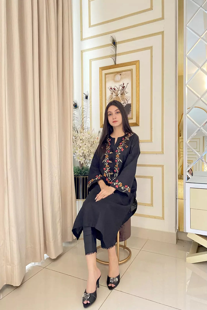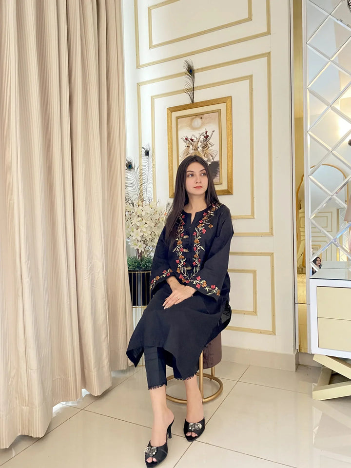 Our 1-piece shirt features stunning multi-colored embroidery at the front and sleeves, showcasing intricate detailing. The shirt is adorned beautiful stitching and hanging tassels, adding a touch of elegance. The rich embroidery makes this piece truly stand out, combining traditional craftsmanship with modern style.