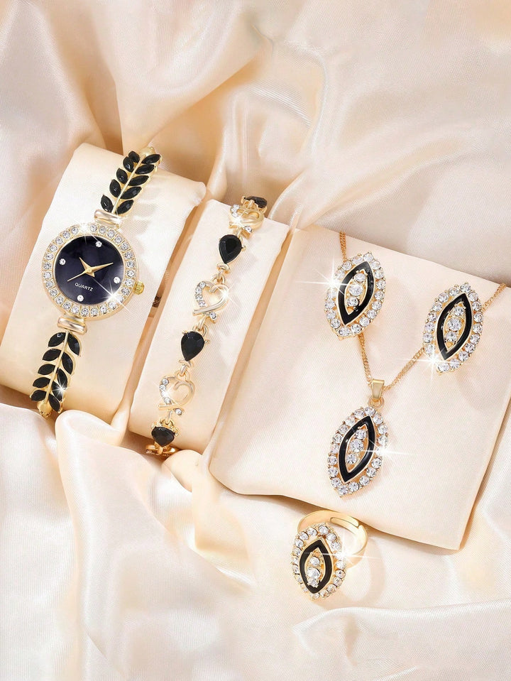 Shein - Valentine'S Day Gift Set 5Pcs Black Feather Fish Tail Strap Casual & Glamorous Diamond Encrusted Dial Quartz Watch And Heart Shaped Diamond Encrusted Accessories