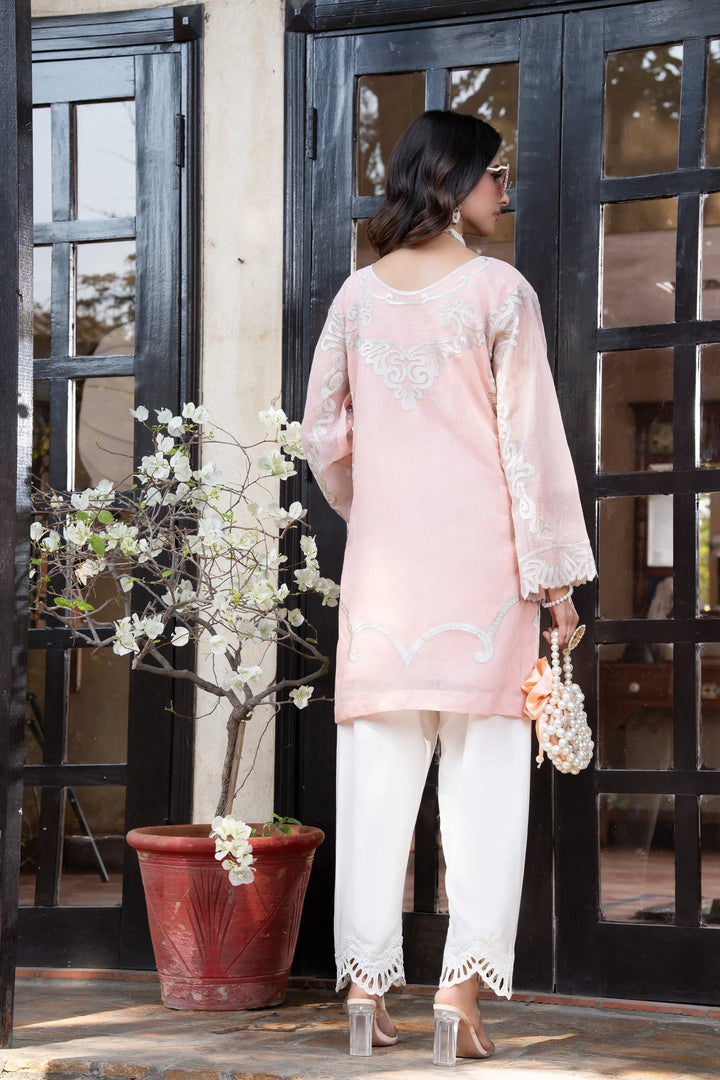 A dreamy fusion of elegance and grace, Fuzzy is a beautifully embroidered Karandi Net ensemble, perfect for summer festivities. The soft pink hue enhances its timeless charm, while the delicate cutwork on the sleeves and daman adds a refined touch. Paired with classic white trousers featuring intricate lace detailing and schiffli embroidery on the shalwar, this two-piece stitched outfit exudes sophistication, making it an ideal choice for elegant gatherings.