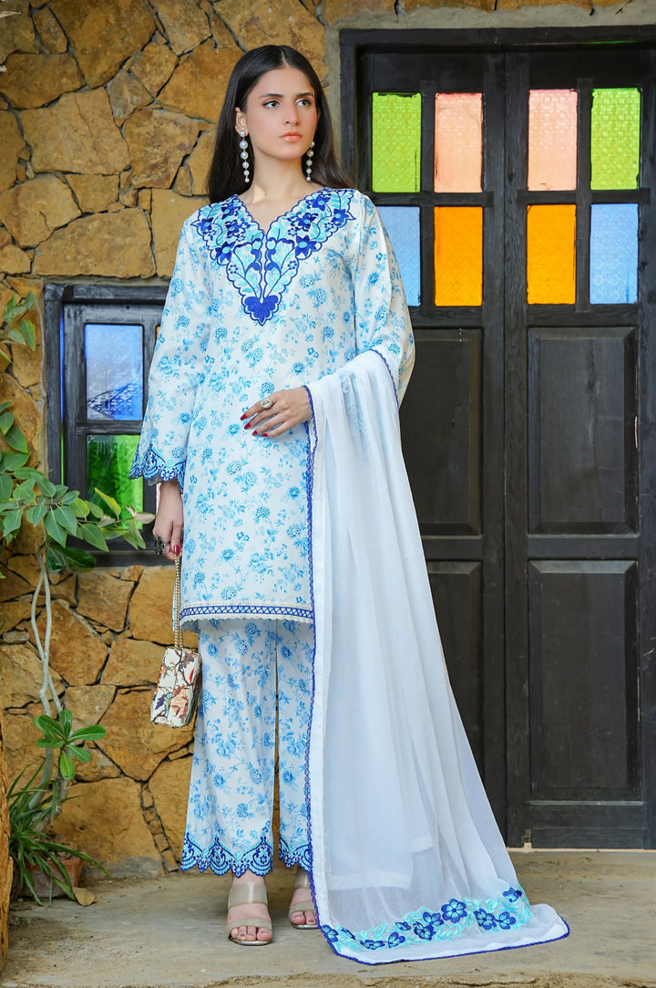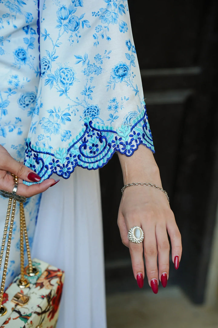 Twilight is an enchanting blend of elegance and charm, crafted from embroidered lawn silk for a breathable yet luxurious feel. The delicate floral embroidery, paired with intricate cutwork on the trousers, adds a touch of sophistication. Accentuated with rich blue detailing and an effortlessly graceful silhouette, this ensemble is a timeless statement—perfect for both festive gatherings and summer soirées.